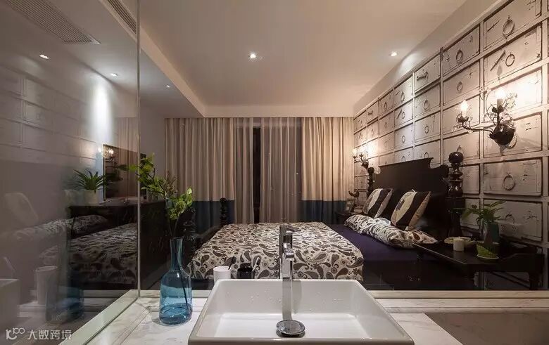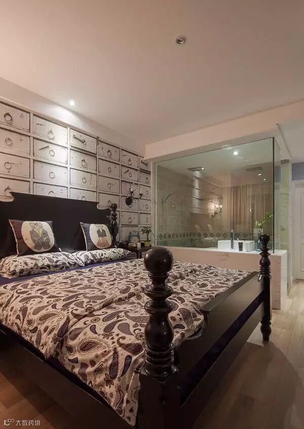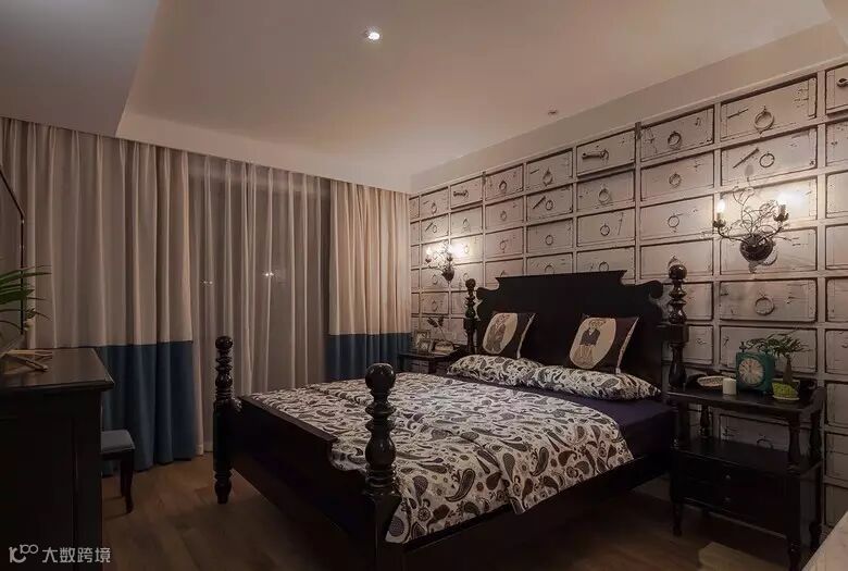 ▲ 主卧的床头背景壁纸图案是一面墙的抽屉