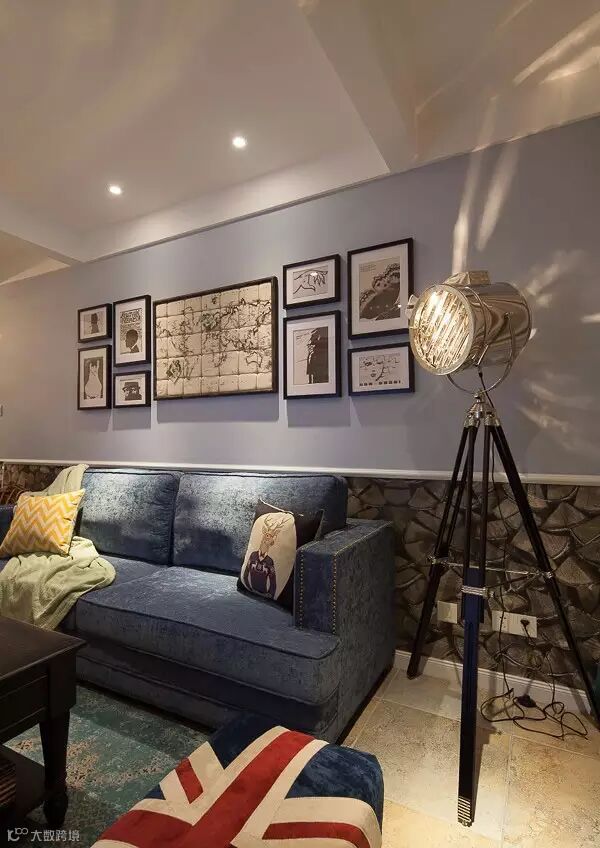 ▲ 沙发背景上部采用蓝色的乳胶漆,下部采用图案特别的壁纸