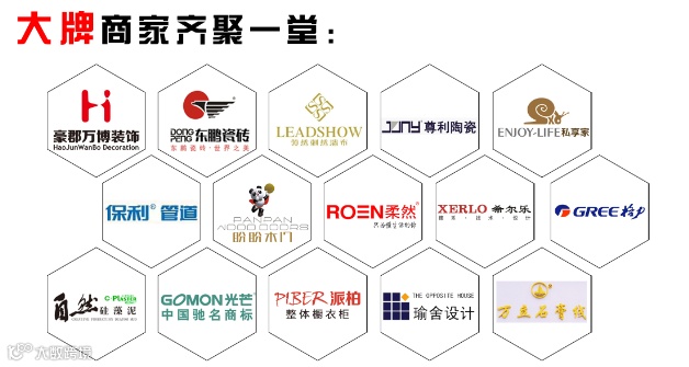 豪郡万博装饰携手东鹏瓷砖、领袖墙布、尊利陶瓷、私享家地板、保利管道、盼盼木门、柔然壁纸、希尔乐集成灶、格力空调、自然硅藻泥、光芒吊顶、派柏整体橱衣柜、瑜舍软装设计、万立石膏板等众多一线主流品牌通力合作,价格降至最低点,让业主以最小的代价,打造出自己所向往完美的家。