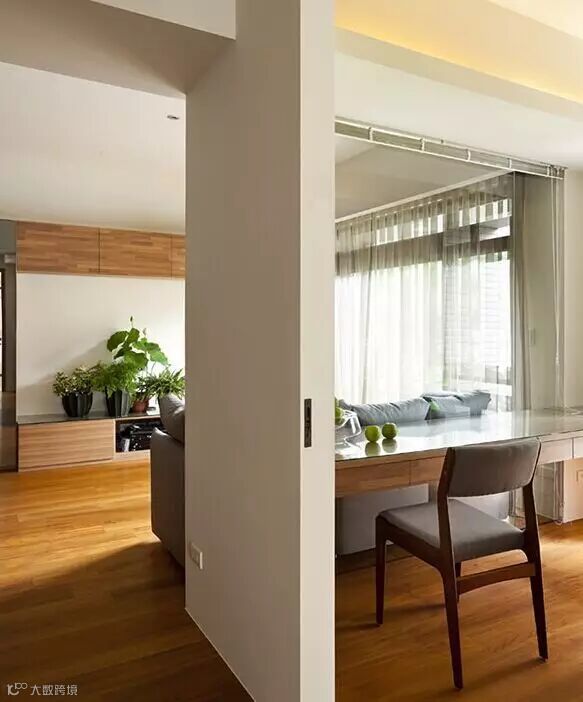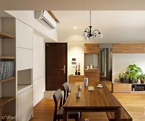 旁边是木式餐桌,搭配地板看上去不错