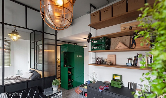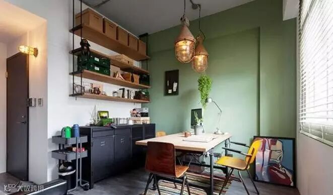 ▲ 进门绿色的铁件收纳柜,保留工业味的同时,增加清新感