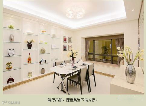 餐厅吊顶一般是小范围的吊顶,根据不同的家装风格作不同设计。以艺术吊灯的形式为主,讲究颜色以及射灯的柔和、打光。天玺装饰建议,如果是欧式装修风格,则按照欧式设计的形状,可以吊一层或多层,层中间可以加线灯或LED灯;如果是中式风格,则可以选择圆形、花瓣形、多边形的吊顶,灯具以中式仿古为宜,透露出餐厅的温暖、秀气。