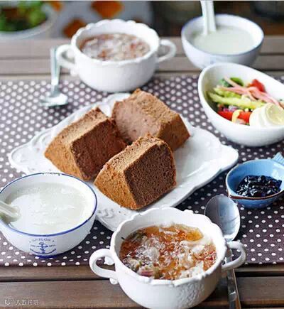 昨晚烤好的可可戚风配野莓果酱,鸡蛋火腿沙拉,玫瑰桃胶,还有营养米糊。