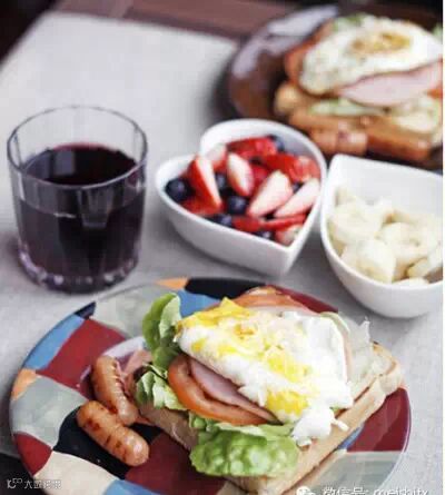 把土司放平底锅里烤脆,铺一片生菜两片西红柿和一个煎蛋,组成了简单又营养的开放式三明治,还有蒜味鸡肉小香肠,饮料是葡萄汁,水果吃蓝莓草莓和香蕉。