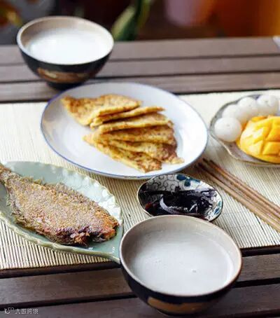 早上俩人同时自然醒来,然后一起站到厨房做早餐,哈~配合着,煎了条偏口鱼,打了绿豆薏米燕麦花生米糊,胡萝卜擦丝加面粉和鸡蛋调味煎成饼,一碟酱菜,水果有好吃的糯米糍和芒果。