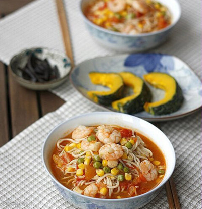 番茄虾仁瑶柱面,蒸南瓜,小酱菜