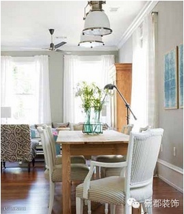 方案三:在小餐厅中运用写大块的颜色,能打破小空间的拘束感,两种颜色的窗帘,将空间分为上下两个区域,增加了视觉上的高度。椅子上的清雅短裙和素雅蓝色桌布,使整个餐厅充满了美式乡村氛围。
