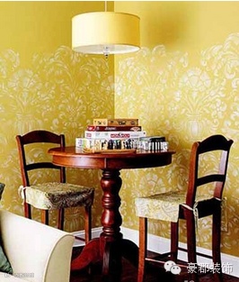 方案二:利用客厅的小角落作为就餐区,黄色的墙纸搭配黄色吊灯让人倍感温暖。吧台高度的桌椅,增加空间的宽敞感。这个桌子既可作餐桌又可作为娱乐休闲的桌子。