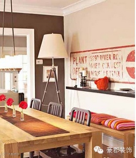 方案七:当你吃饭时,有人陪伴是件令人高兴的事,但是额外的划出一个区域会很占地方,这个餐厅设计就起到了两全其美之效。在墙边放上一个长凳,摆上一个软软的靠垫,也能展现出主人的热情好客。