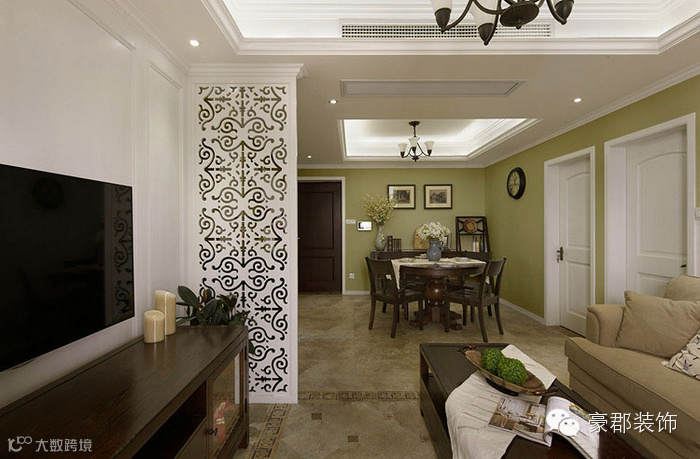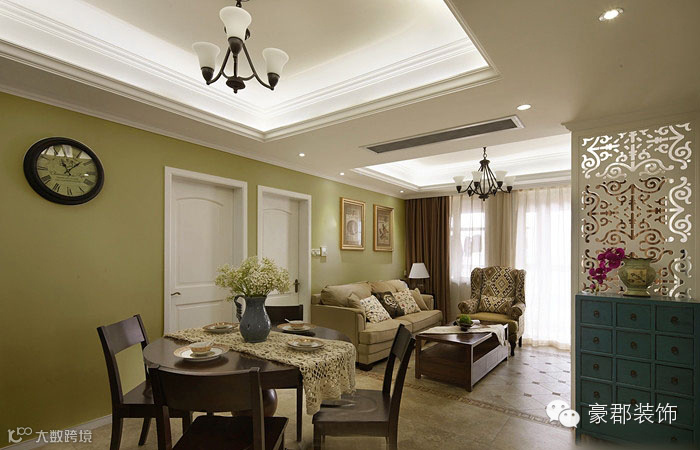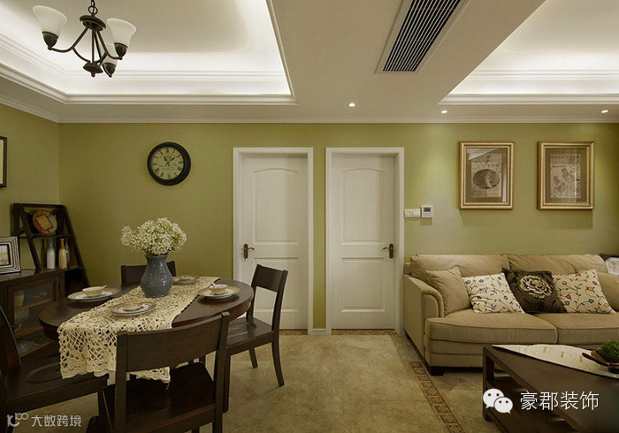 设计师的细腻的心思,把这个绿色搭配白色的门和门套,使整个空间的感的很清新自然。在家具的搭配上面也是下了很大的心思,之前客户想买白色的家具,跟门套一个颜色,在设计师的建议下选择深色的餐桌和茶几。稳重不失大雅。
