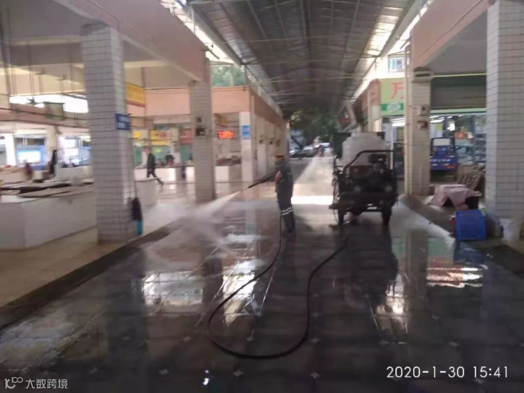 4、根据政府“1110”工作指示要求,每日安排两台高压洗地机在夜间配合市场管理站对市场进行一日一冲洗消杀。