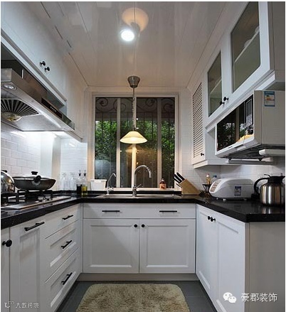 厨房全景,白色的整体橱柜,带点简欧风格。开了一个玻璃式的窗户。厨房外面的景色映入室内十分的不错吧。
