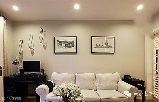 换个角度也会发现客厅不一样的美,白色素雅的色调。三人位的布艺沙发,实木的地板上采用了黑色的现代风格的茶几,配上白色的花束也是小有情调的额!