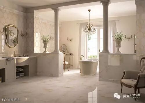 两根大理石柱将卫浴间洗浴和洗手两种不同的功能作出明显地划分,既高端大气又不失典雅的格调。璀璨的吊灯与对称的花艺装饰相得益彰,体现浪漫与唯美的空间气质。