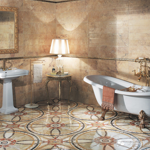 曲线柔美的金色镜饰、做工细腻考究的壁灯用卓越的品质彰显欧式优雅的魅力,金色印花的墙砖则显得格外贵气。