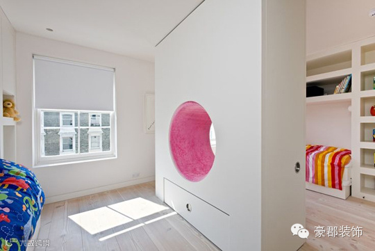是收纳柜,也是隔断,它们共处一室。粉红色隧道,避免了厚重的墙壁带来的压抑感给空间创造更多的乐趣。