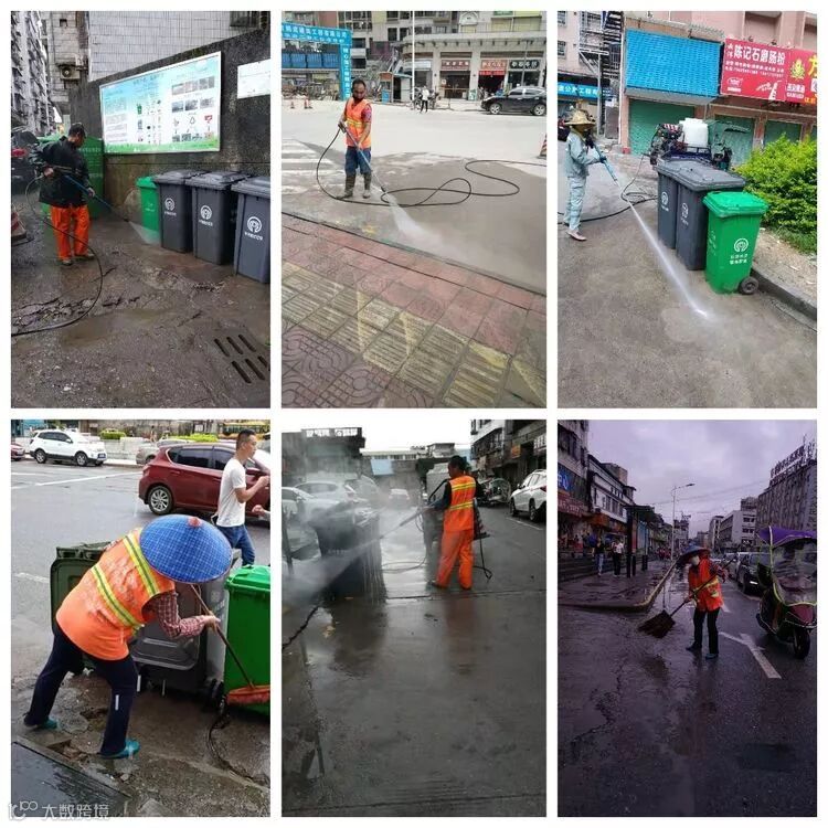 6月17日至23日县城各辖区员工每天按正常作业清扫大街小巷、清洗垃圾桶、果皮箱、公厕,清理卫生死、小区、背街小杂草、中间护拦、乱张贴、涂鸦、牛皮癣,垃圾车按4班制正常作业清运垃圾,洒水车按正常作业洒水,本周出动高压清洗车2台正常清洗新旧城区行人道、广场、步行街、中间护栏。