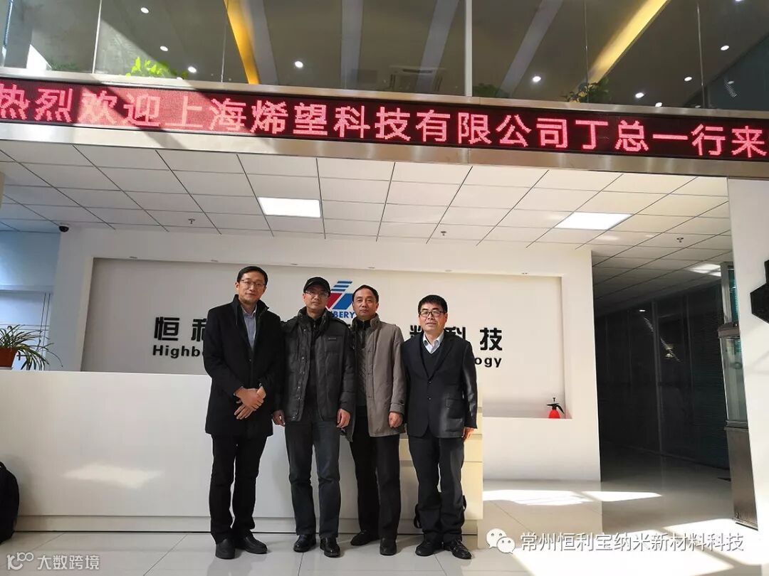 12月14日,上海烯望材料科技有限公司总经理丁古巧,项目经理田素云,江苏悦达纺织集团有限公司研发工程师周卫东,江苏悦达家纺面料有限公司研究院副院长严以登一行莅临我司就石墨烯原位聚合锦纶展开洽谈。
