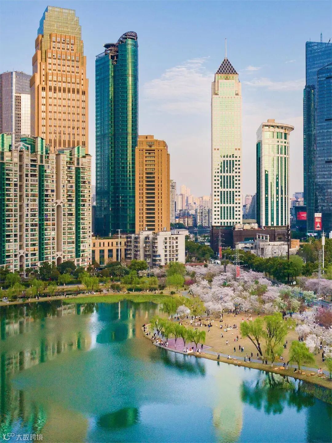 武汉西北湖绿化广场樱花树大面积盛放,汉口建设大道高楼鳞次栉比,湖面、樱花、绿道、高楼交织出了一幅生机盎然的城市画卷。(湖北日报全媒记者 任勇 摄)