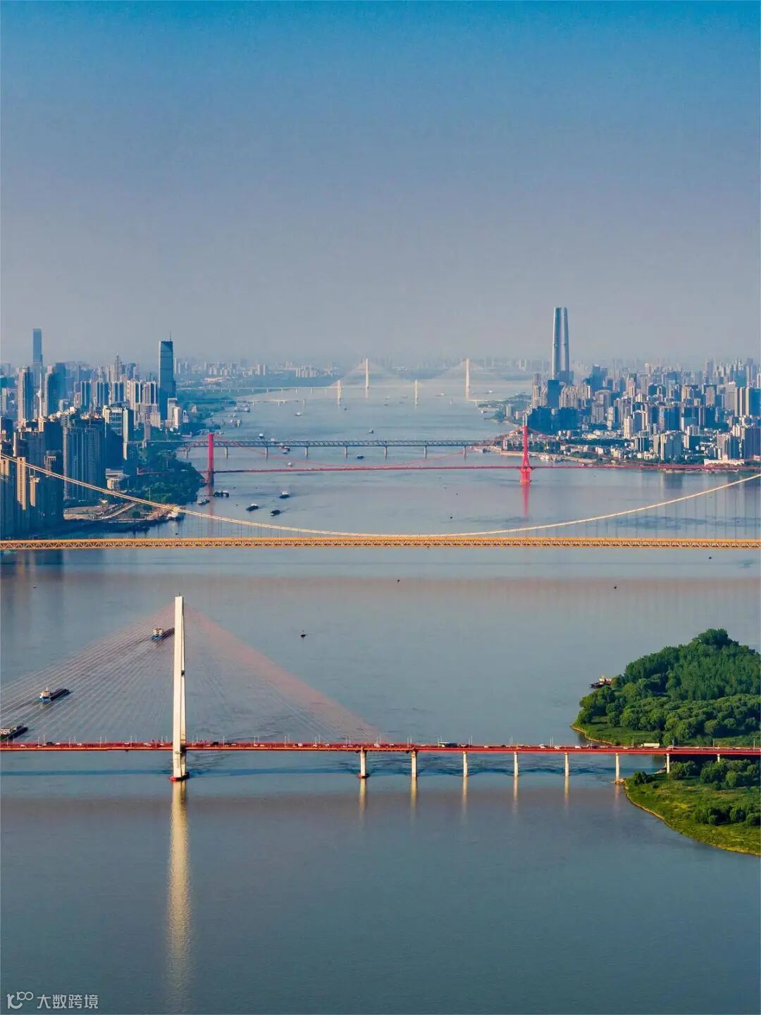 从高空俯瞰长江武汉段,水清岸美,6座跨江大桥尽收眼底。(湖北日报全媒记者 柯皓 摄)
