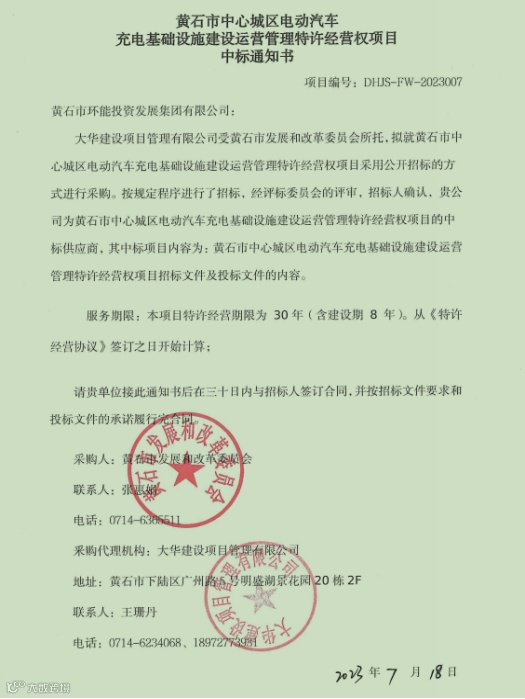 黄石市发展和改革委员会于2023年7月18日发布中标通知书,黄石市环能投资发展集团有限公司为黄石市中心城区电动汽车充电基础设施建设运营管理特许经营权项目中标单位。自签订协议之日起环能集团拥有黄石市中心城区(不含开发区•铁山区)三十年电动汽车充电基础设施建设运营管理特许经营权(含建设期八年)。项目特许经营期限内拟定建设完成 3167 个快充充电桩和 6000个慢充充电桩。