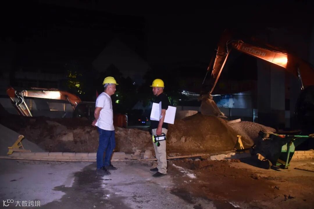 ▲图解:2022年5月27日深夜11点,排水公司张财(左一)在桂林南路协调污水管网施工事宜