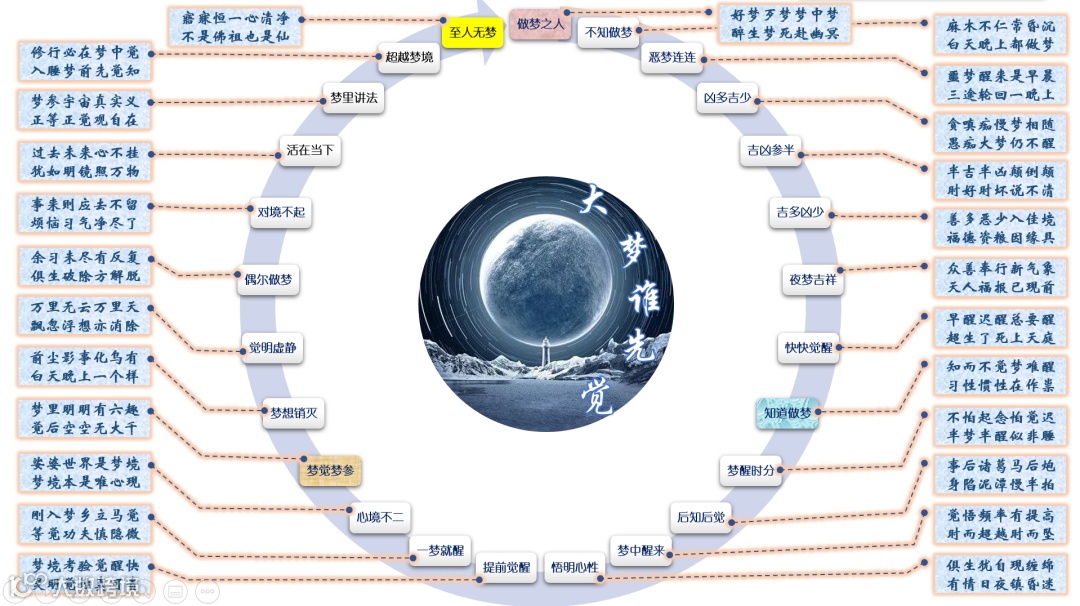 有道是:大梦谁先觉,平生我自知。一个人从不知在做梦到知道,从知道做梦到似醒非醒,半梦半醒再到梦醒时分,从马后炮到梦觉,然后梦觉到梦参,从梦超到至人无梦,这是一个漫长的修行过程。