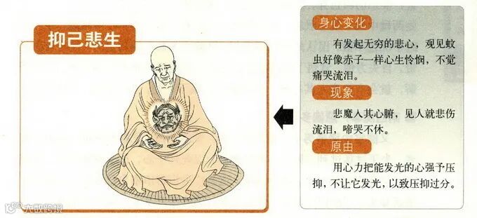 但是如果作已得圣证的理解,自己认为已证诸佛同体大悲,则有悲魔得其方便而入其心腑,摄其神识,一见到人,心就释放出无穷的慈悲,甚至于看到人就流出悲痛的眼泪而不能够停止,由此无法自制而失于三昧正受,反成邪受,来世当从而沦坠恶道。”