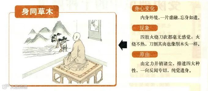 突然间感觉双手双脚跟外在的草木一样,能耐得住火烧、刀斫,都没有一点感觉。用火烧他的身体,不能着热,用刀割他的肢肉,就像削木头一样,没什么感觉!