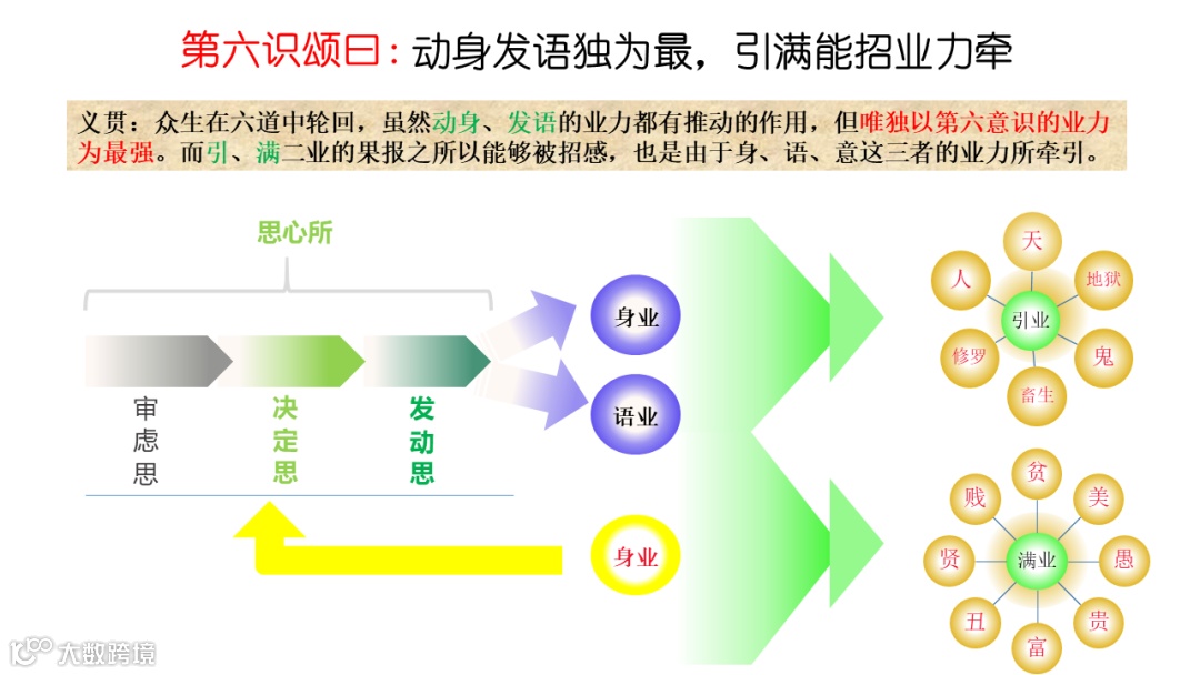 只有人的第六意识,才有思考的能力,它会产生一种学习的力量,从学习当中产生观照来做自我调整,翻转命盘,其它道都不可以,它只能够活在生命的习惯性当中。所以人生的第六意识的确是一个让我们成就永恒生命的最大机会。