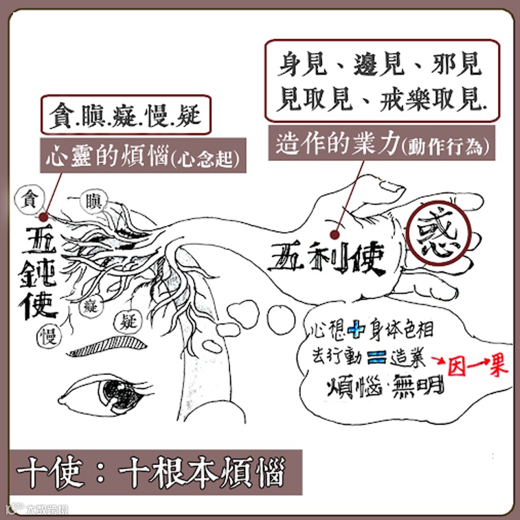 具体来讲,思惑亦称之为五钝使,即是贪嗔痴慢疑习气,即是俱生我执。
