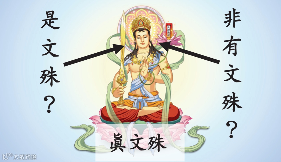 但是,我这文殊在因缘上,也不能够说没有文殊的存在。而我现前确实是有个文殊之真体在,并非没有文殊真体(比喻真如本性是有真体的,不是什么都没有)。所以,在这当中没有所谓的是文殊跟非文殊这种对立的思考。其实真如本性全体不变,全体随缘,或自性空因缘有,因缘有自性空。就现出一个文殊,没有另外一个文殊,或者非文殊可言。”