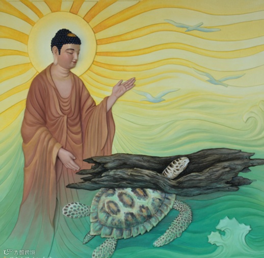 一只盲龟在苦海里呆了整整6万年了,一天心血来潮想上来呼吸一口新鲜的空气,于是慢慢悠悠的浮上水面。正在这时,一块木板漂了过来,木板中间有个小洞,盲龟头正巧从小洞伸出来,于是眼睛一下子明亮了。真是万古奇缘!