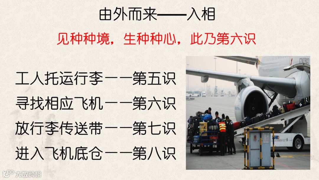 为了更形象的理解八识,我们拿乘机旅行来做个比喻:把聪明伶俐的第六识比喻为能了别相应办理登机柜台的旅客;把呆的第七识比喻为放行李的传送带;把前五识眼耳鼻舌身五个兄弟比喻为搬运行李工;把第八识阿赖耶识记账员比喻为飞机的底仓。
