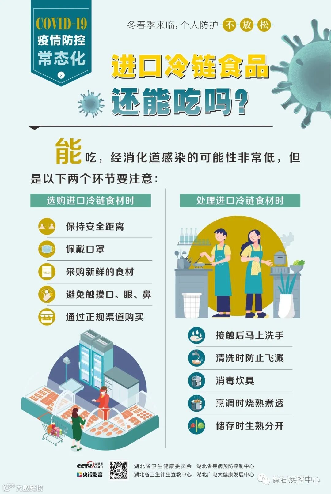3.正确选购冷冻冷藏食品。市民选购海鲜、肉类等冷冻冷藏食品时,需选择正规超市和市场购买,切勿购买无“食品安全追溯码”的冷链食品,在选购、清洗加工时,应做好个人防护和食品外包装消毒,防止溅洒污染,生熟分开、分隔存放,煮熟蒸透。处理完后及时洗手和消毒器具。