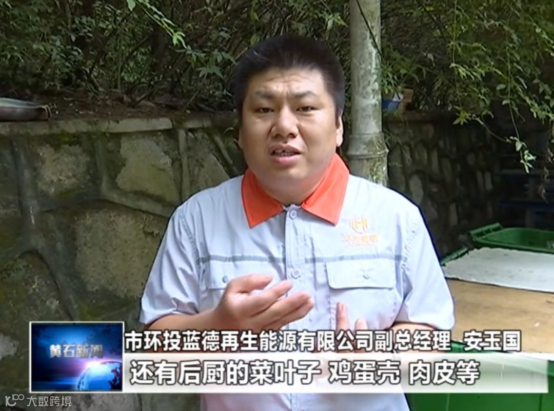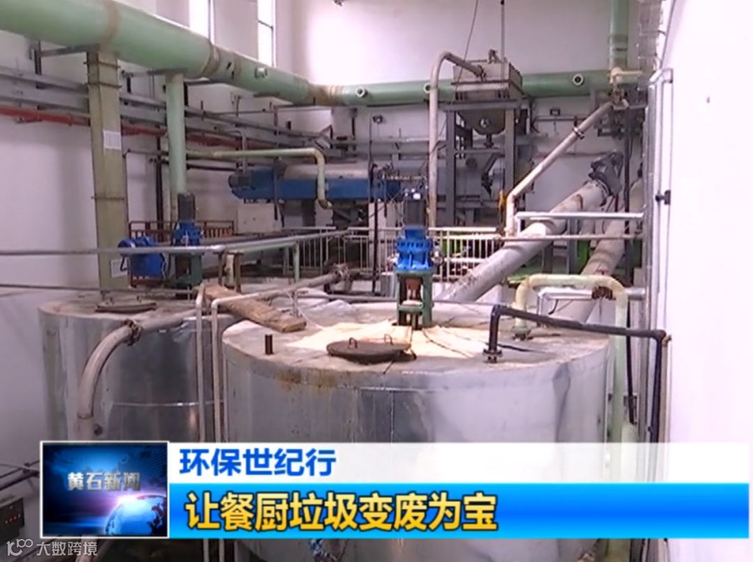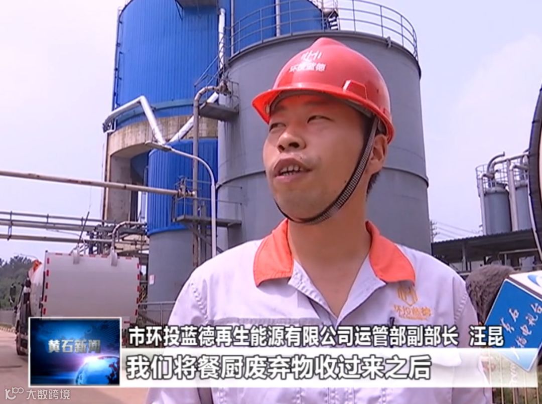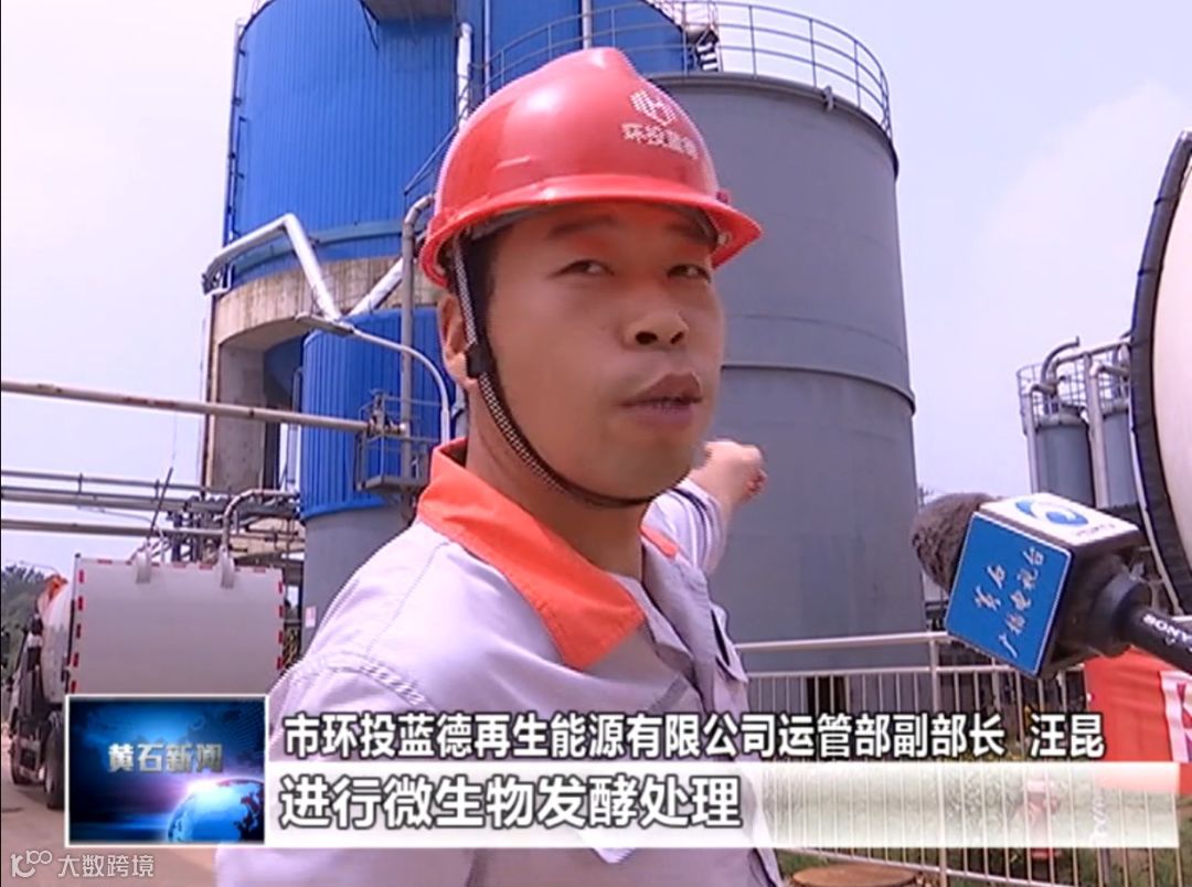 市环投蓝德再生能源有限公司运管部副部长汪昆介绍到:“我们将餐厨废弃物收过来之后,进入我们的预处理系统,进入预处理系统后,进行破碎分选,分选后进入我身后厌氧罐进行微生物发酵处理,微生物发酵处理后,产生的沼气存放于沼气囊之内,然后,进行沼气发电,达到变废为宝的目的。”