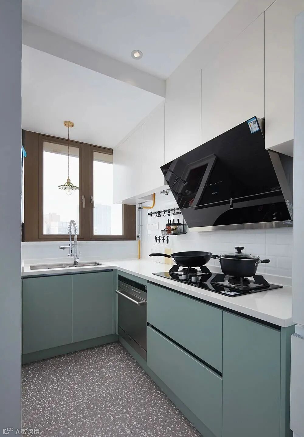 ▲ U型厨房,灰色水磨石地砖搭配白色墙砖,在薄荷绿色的衬托下,显得愈发清新