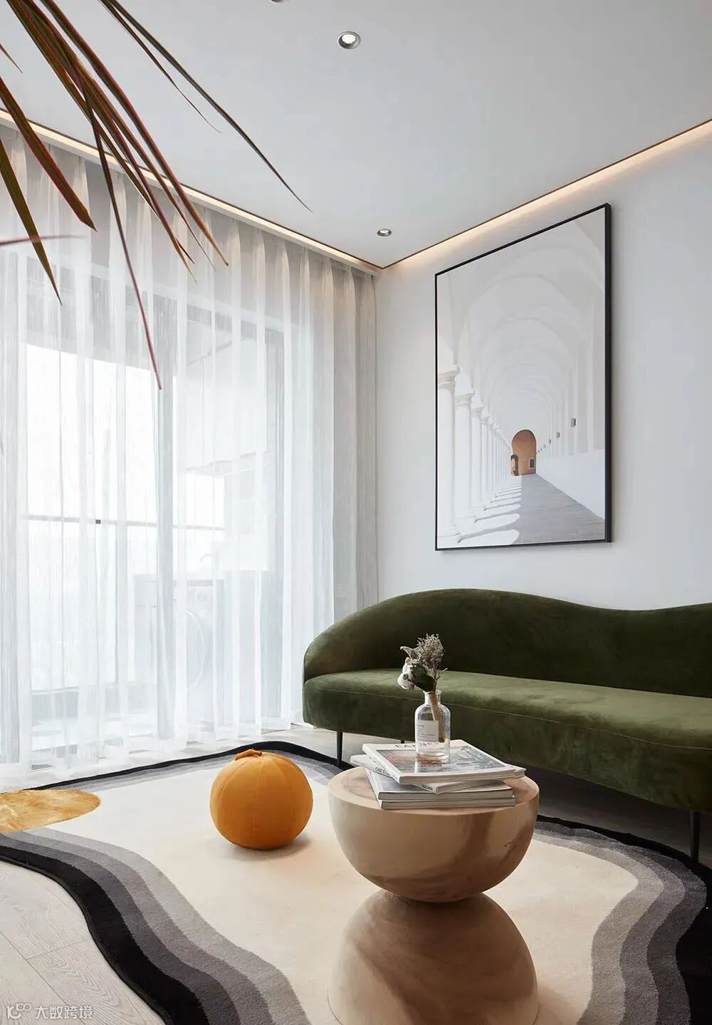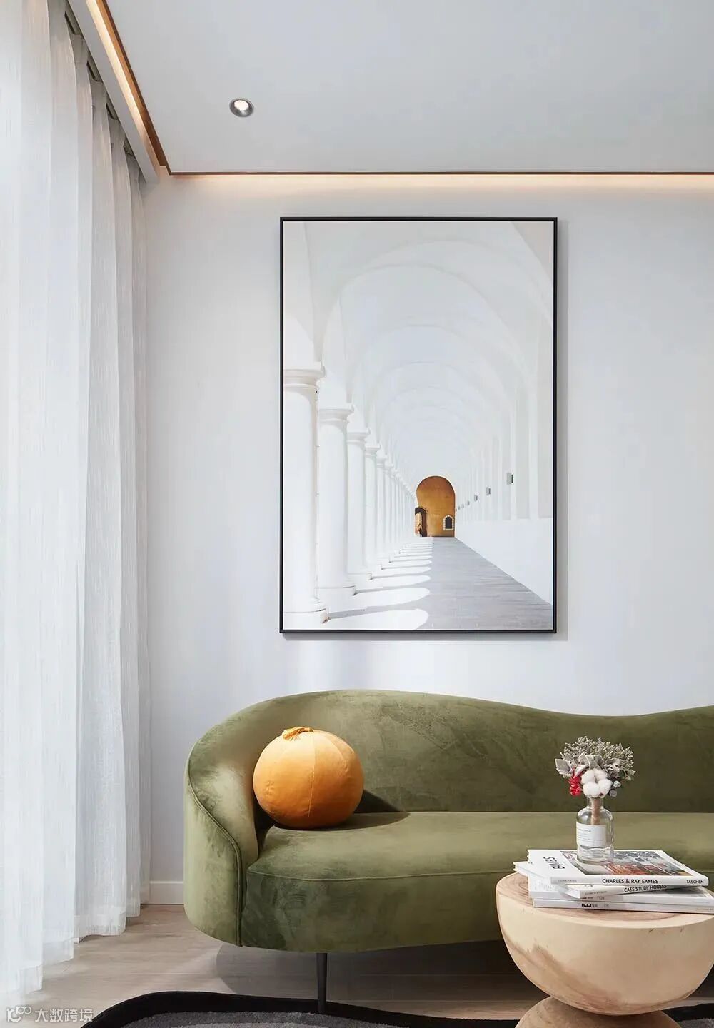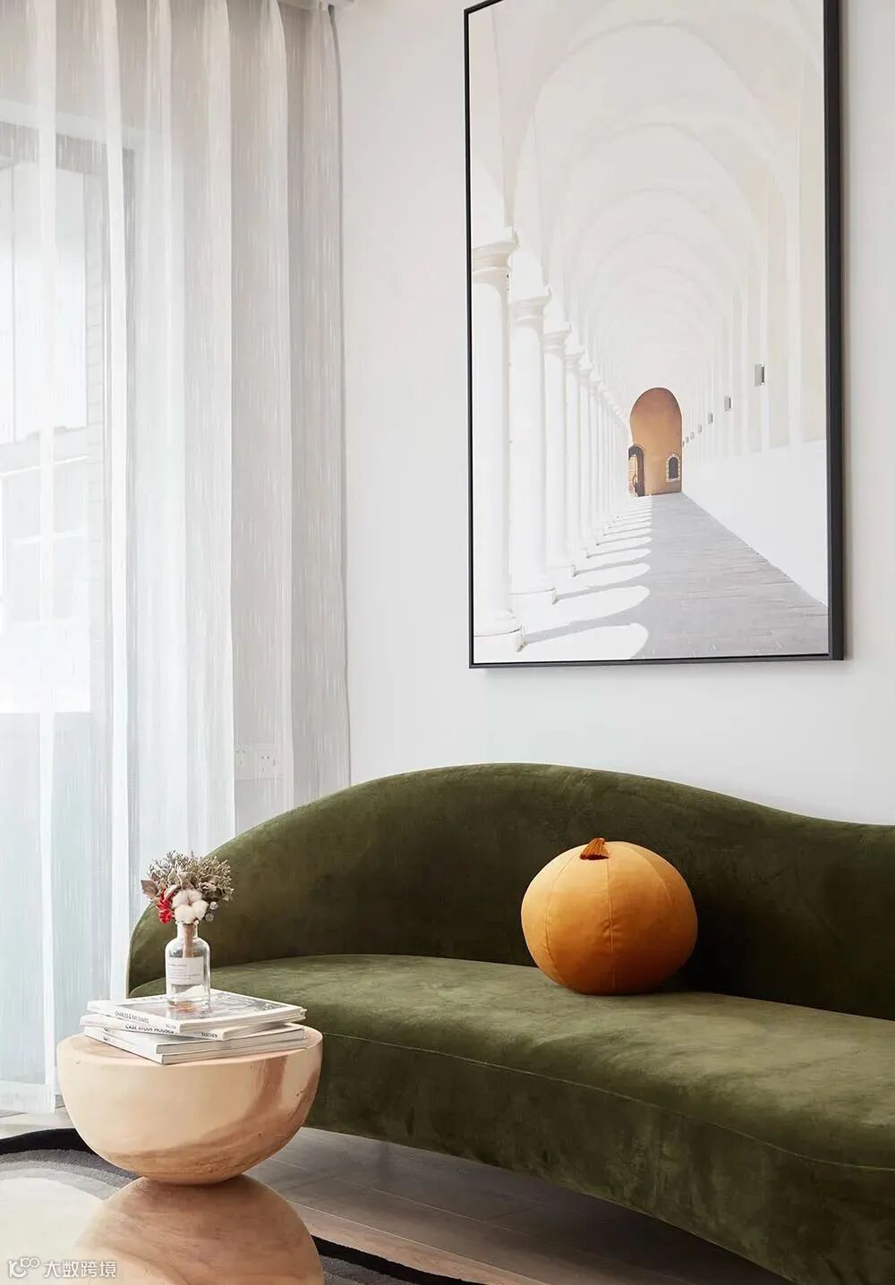 ▲ 墙上的挂画,在视觉上延伸空间,莫兰迪绿色丝绒沙发与原木色的漏斗小茶几相搭配,质朴而优雅