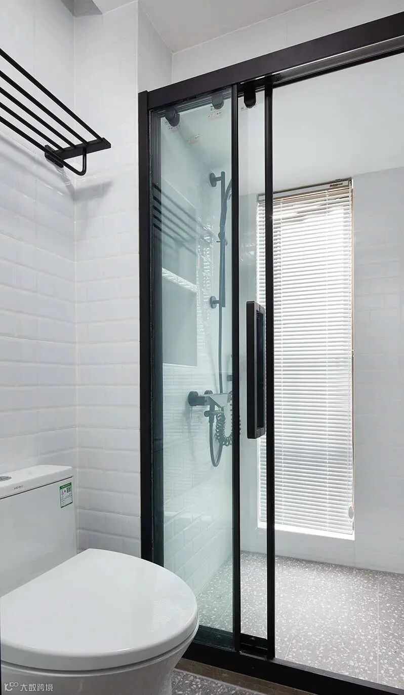 ▲ 卫生间延续厨房的水磨石瓷砖地面与白色墙砖,黑色的卫浴五金勾勒出视觉层次
