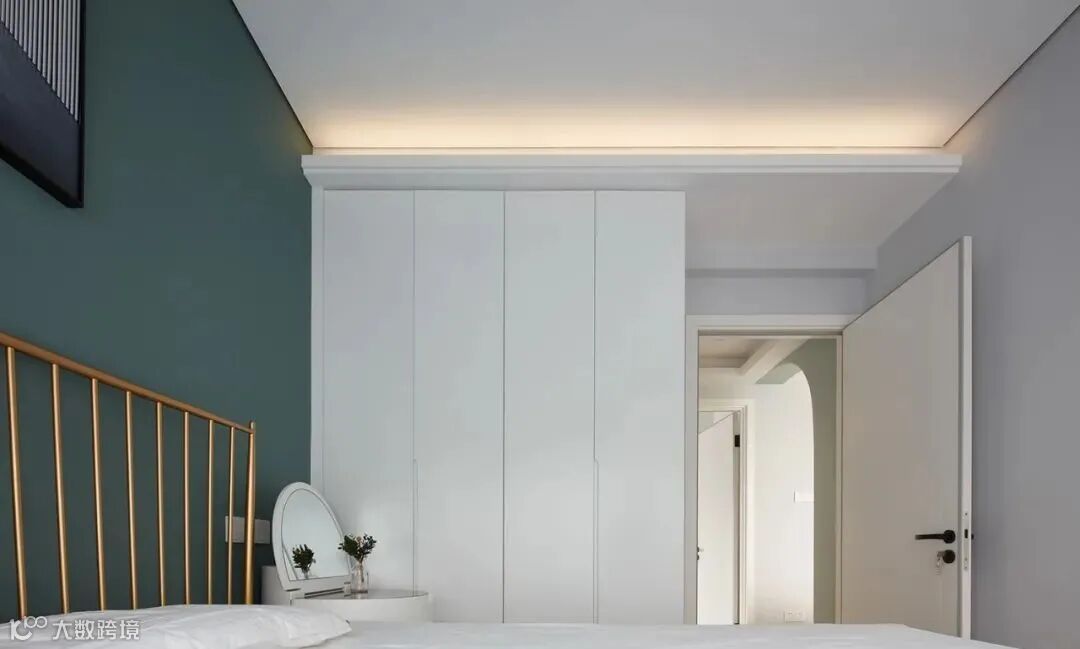 ▲ 床侧的白色置顶衣柜是卧室的主要收纳空间,顶面加入隐形灯条增加层次营造氛围