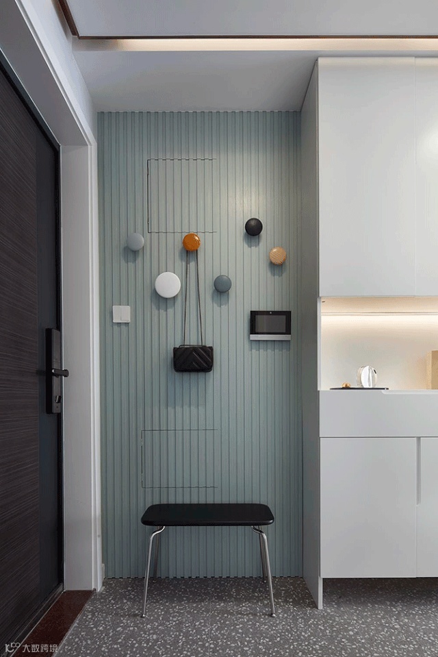▲ 入门处贴实木波浪板,隐形设计把电箱等隐藏起来,空间整洁利落,莫兰迪色系搭配纽扣挂衣钩,装饰性和实用性俱佳