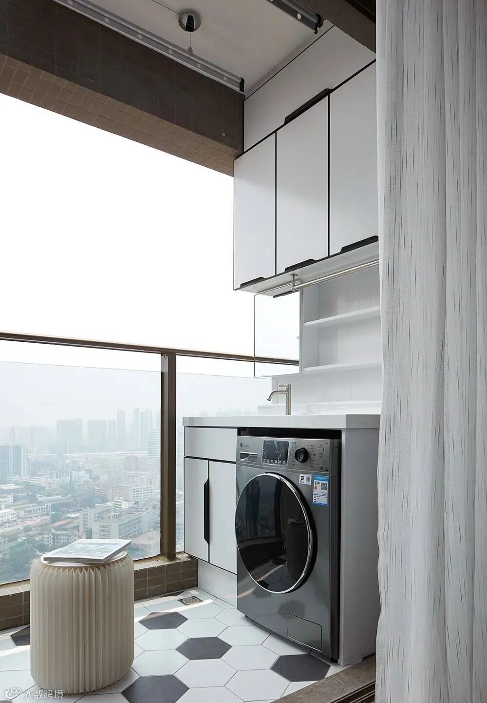 ▲ 六边形的瓷砖,跳色的黑白搭配,让生活阳台也变得美观时尚、灵动有趣