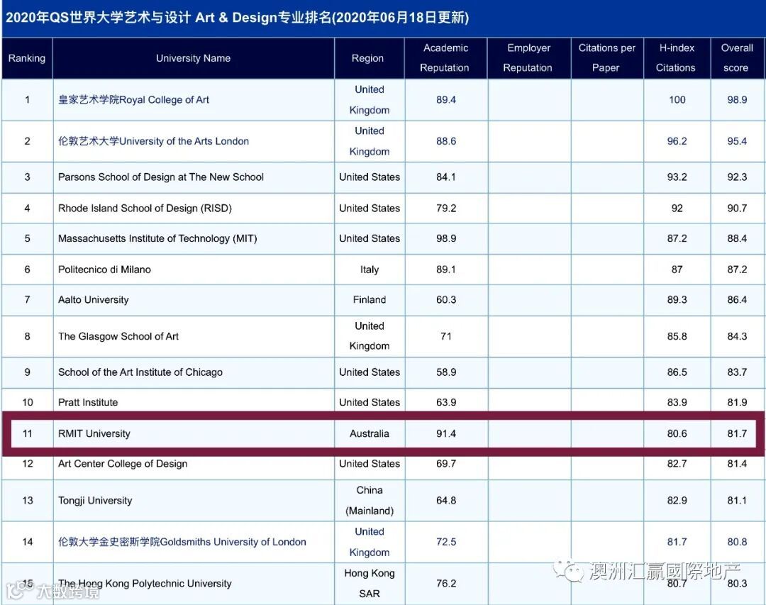 2020年QS世界大学艺术与设计专业 RMIT排名第11