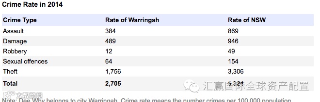 DeeWhy这个区域犯罪率较低,与人口结构有着相当大的关系,由于白人为该区域居住主体,区域犯罪率低于澳洲平均水平一半。该区域的安全系数较高,也是不断吸引白人及富裕阶层人种进驻该区域,房价也由此增幅较快。