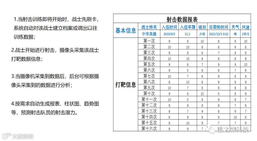 可进行靶环的自动识别计算,通过无线网络接入。实现公正性、可靠性、快速便捷记录射击状况的优势。自动报靶管理平台有报靶精度高、成本低、适应能力强的优点,通过该平台的建设可以突破传统的训练方法,极大的提高训练效率和训练水平。产品适用于各种作战部队、公安边防系统的科目练习和军事比武演练。