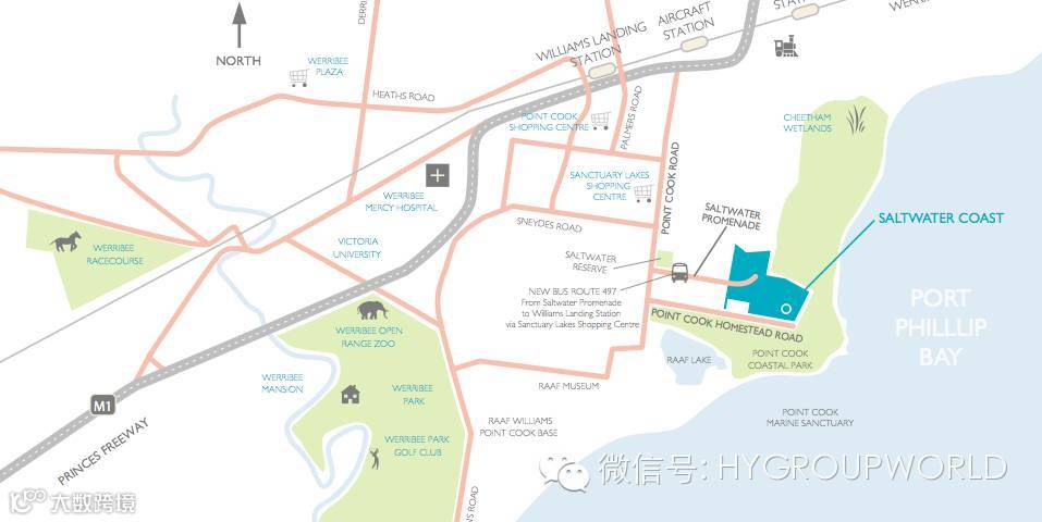 Saltwater Coast 小区出口即是 Point Cook Road, 向北行驶 6.5 公路可 直接驶入 Princess Freeway 高速,25 分钟即可驶入墨尔本市区。Saltwater Coast 小区距离已经通车的城铁车站 Williams Landing 站。城 铁火车直达墨尔本 CBD。Saltwater Coast 小区内已有公交线路贯通, 途经购物中心,学校及火车站。