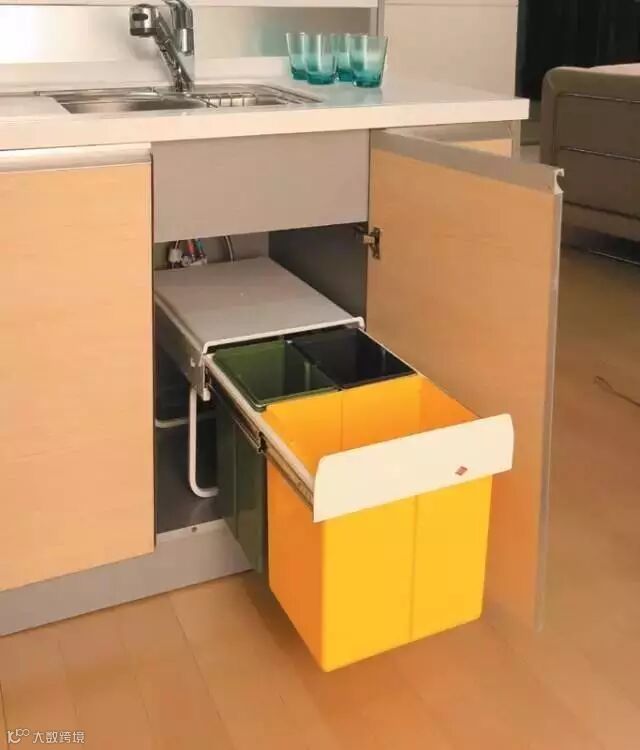 水槽下的空间因为有管道,水汽多,所以绝对不宜收纳食物与碗筷,最好用来放置清洁用品、垃圾桶等。收缩式收纳架放这里就正合适,更适应不同的橱柜空间。