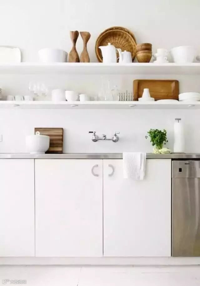 用壁挂式的搁板做置物架,架高一点,下面留的空间可以挂些不规则的锅具哦~