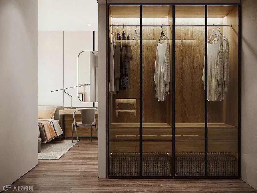 入墙式的衣柜和墙壁十分贴切,节省空间,利用率高,而且美观,储物功能强,越来越被青睐。