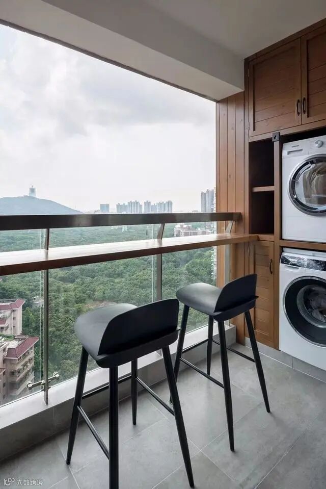 阳台做为室内与室外的连接,寄托着很多人对生活的憧憬,洗衣机、烘干机解放了阳台空间,可以任意发挥,打造成想要的休闲空间,摆上沙发、小茶几,与花花草草为伴,还可以在靠窗的位置做个小吧台,与爱人、朋友坐在窗边,聊聊天,品品酒,也是别有一番情调的。